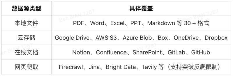- 数据源割裂:企业数据分散于 ERP、Wiki、云盘等数十个系统,适配成本高。