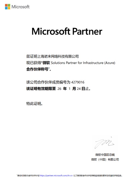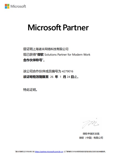 诺未是微软端到端解决方案指定服务商,具备丰富且权威的微软合作伙伴资质:不仅可提供 Microsoft 365 现代化办公工具相关服务,更是微软认证的数字化与应用创新、数据与 AI、专业级云基础架构、IT 安全、专业级 AI 创新、低代码开发等多领域服务伙伴,同时还入选微软生态优选的云供应商和大企业协议服务伙伴(覆盖中国云 / 国际云),能够为客户提供全栈式的微软体系技术与服务支持。